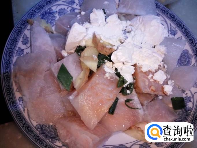 将鱼块装在盘子里,放料酒、适量盐、辣椒粉、少许鸡蛋清、淀粉、生姜、香葱,搅拌均匀,腌制30分钟-1小时,直至入味。辣椒粉可放可不放,根据个人口味。