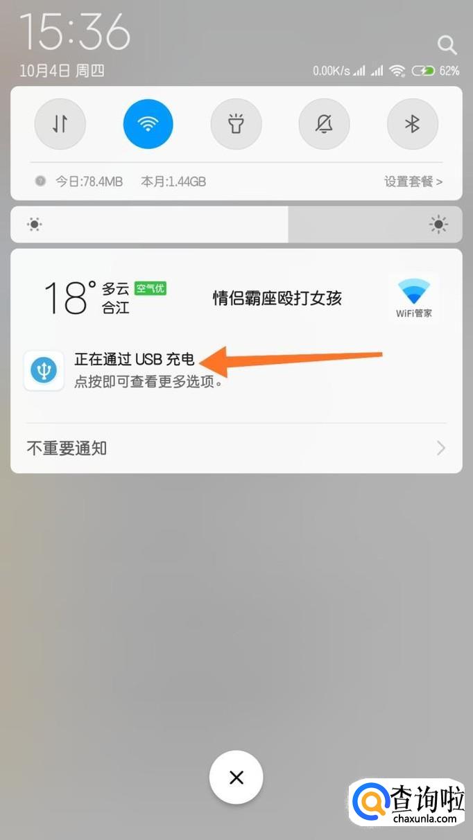打开我们的安卓手机,拉下状态栏,可以看到有一个“正在通过USB充电”,点击一下,选择“传输文件”,即可在电脑上面看到手机内的文件信息了。