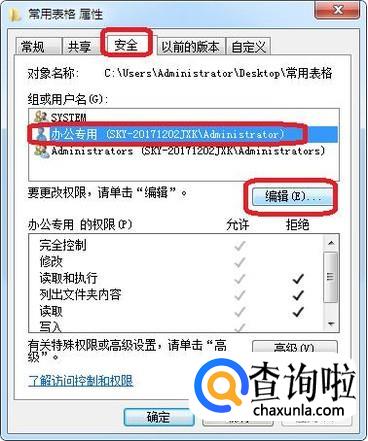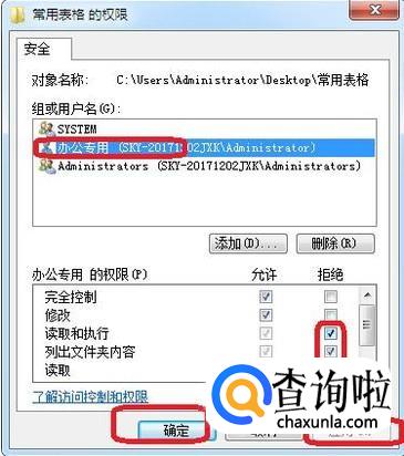 此时,就可以修改当前用户的权限了。如图所示,选中用户后,把该用户的权限里面拒绝项的复选框去掉对勾,点击应用和确定。此时,就可以进入文件夹了。