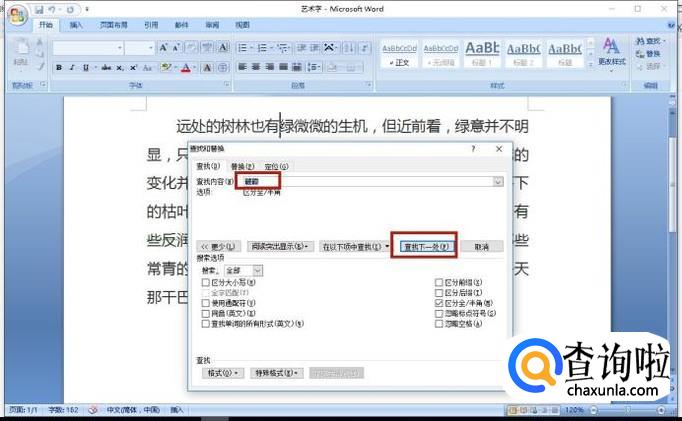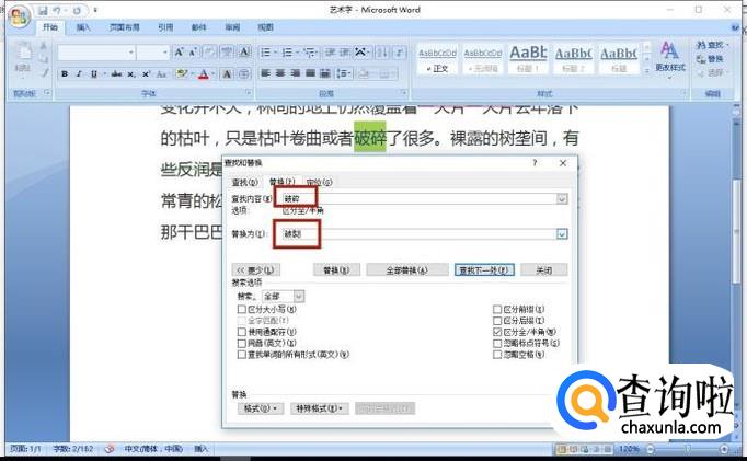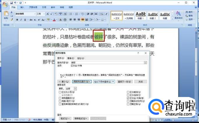 弹出“查找和替换”的对话框,在搜索框中输入所查找的内容,如”破碎",还可设置”搜索选项“,设置查找的大小写等项,然后点击“查找下一个”。如果想醒目提示,还可选择"阅读突出显示“。