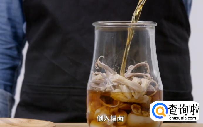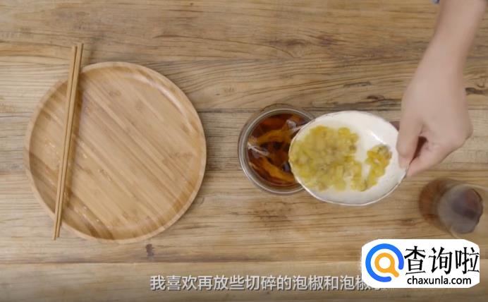 然后,再将食材放入罐中,倒入糟卤,再放些切碎的泡椒和泡椒水,放入冰箱冷藏1-2小时入味。