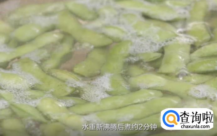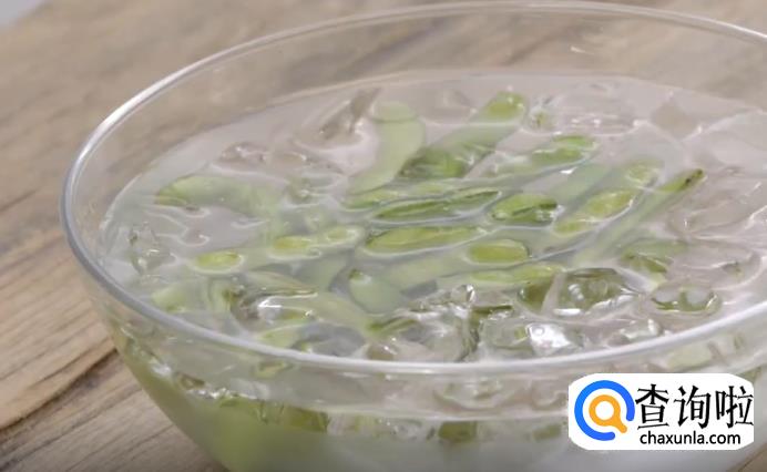 先将毛豆洗干净,用剪刀剪去一头以便入味。烧一锅沸水,放入毛豆,水重新沸腾后煮约2分钟后捞出,加入有冰块的水中。
