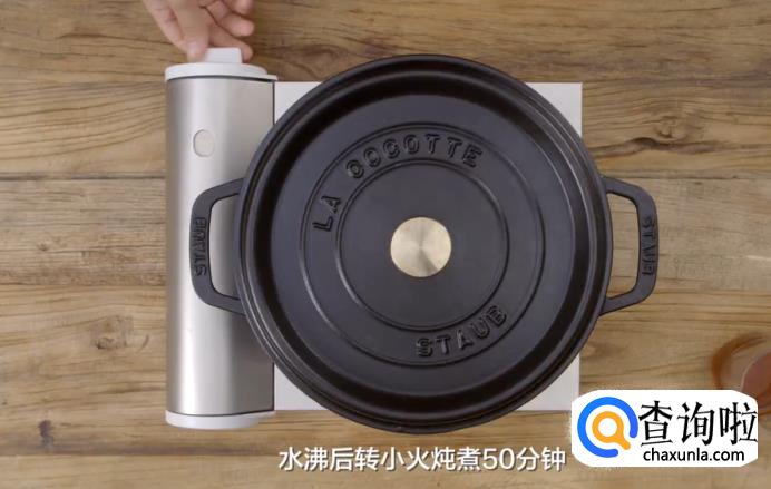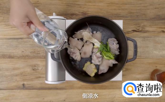 取一口炖锅,先放猪手,再加入葱结和拍碎的姜块,然后倒入适量的凉水,大火烧开后淋入料酒,水沸腾之后转小火炖煮50分钟。