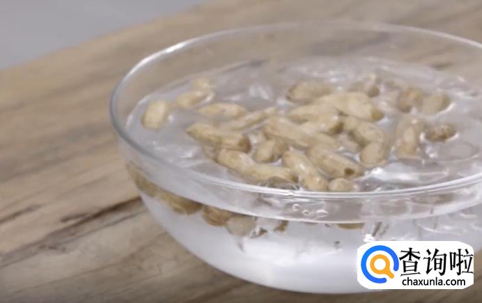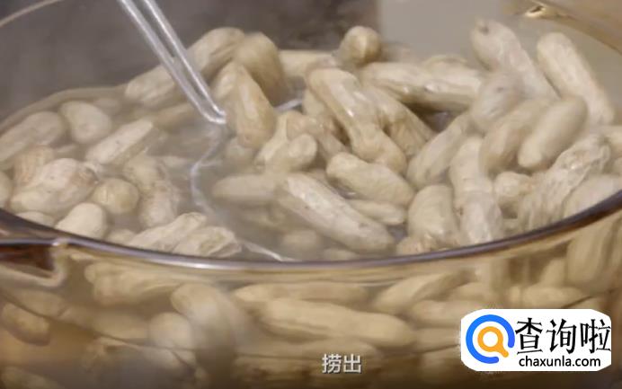 接着,把带壳花生搓洗去泥后,倒入水烧开的锅中,煮沸后约5分钟捞出,过凉水备用。
