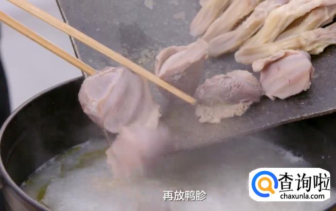 接着再放鸭胗和鸭舌,继续炖煮10分钟。煮好之后,将食材取出,放入凉水里降温。