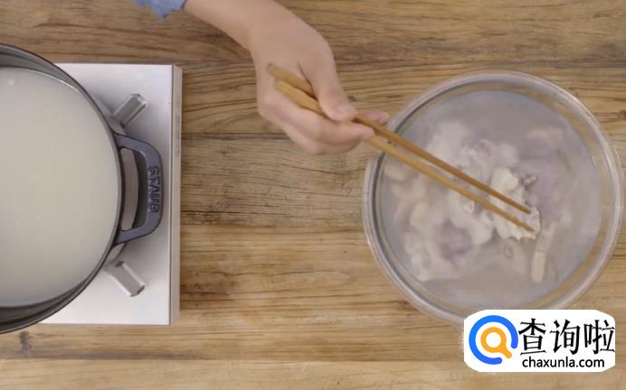4、荤菜一定要冷水下锅,这样里面的蛋白质凝结会比较慢,血污会充分地出来。鸭舌和猪爪在焯好水以后,可能会有白色的物体在上面,我们需要用小刀把它刮干净,这样就不会有腥味。
