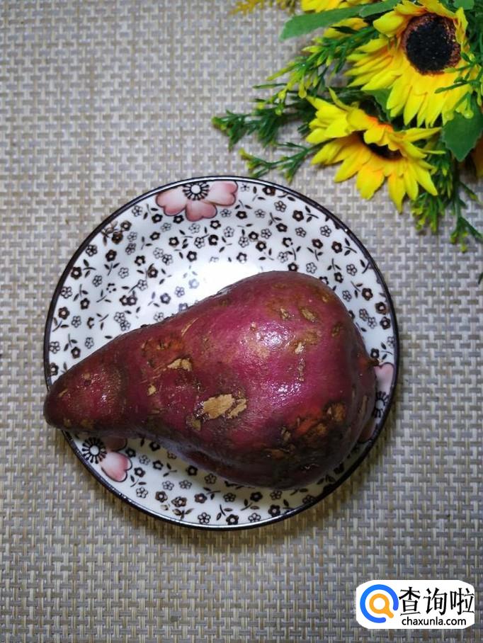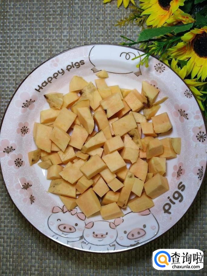 准备一个香甜的红薯,洗净去皮后,切成小块,放入盘中备用。这种颜色稍微有点发黄的红薯,口感比较甜。