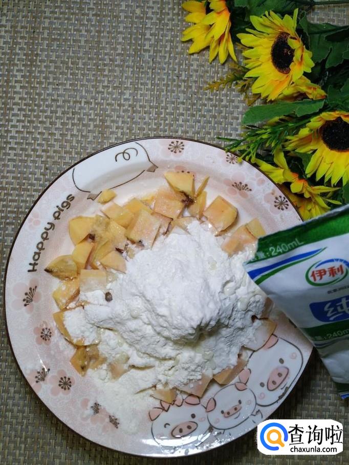红薯适量,白砂糖适量,纯牛奶适量,面粉适量,香菜适量。