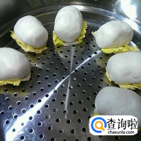 在笼屉上摆好菜叶,把做好的猪儿粑放到菜叶上,大火蒸熟。