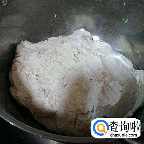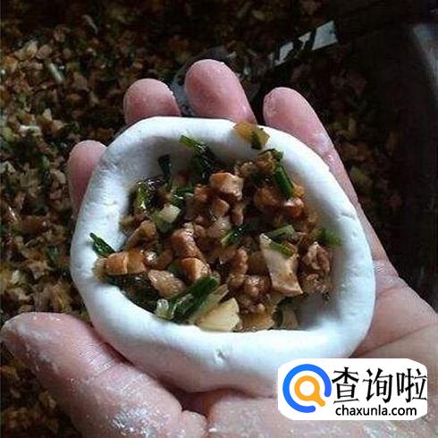 将磕粉团子分在小块,压扁后,窝出形状,将肉馅包在里面后捏合,团成椭圆形。