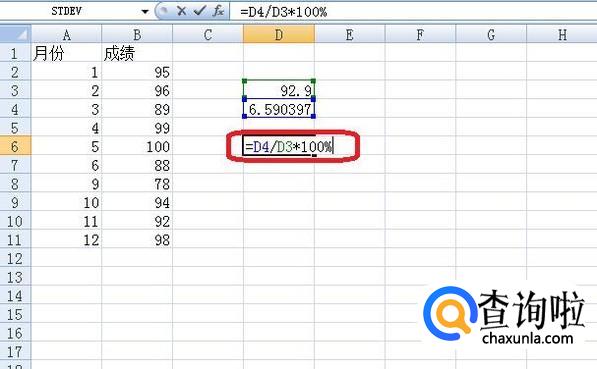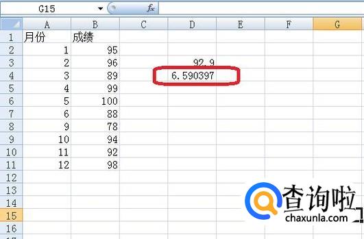 用STDEV函数计算标准偏差。点击另一空白处,点击“fx”标签,选择STDEV函数。选中第3步相同数据后,计算得到结果6.590397。