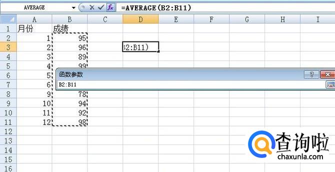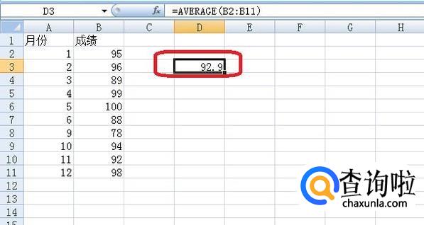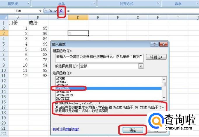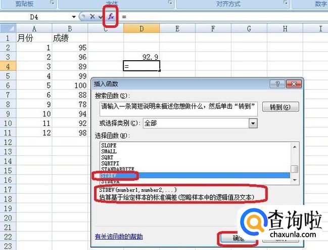 我们先用AVERAGE函数计算算术平均值,点击图中空白处作为函数及运算结果输出位置,点击图中所示“fx”标签,在出现的“插入函数”选项框中,选择函数AVERAGE,点击确定,选中数据后,计算得到结果为92.9。