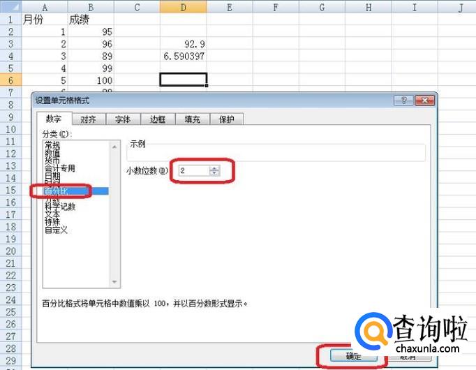 最后计算RSD。因为RSD是百分比的数字形式,需要先设置一下,点击空白处,右键点击“设置单元格格式”,进行如图所示选择。然后在该空格处直接输入如图公式,按回车键,得到RSD数值7.09%。