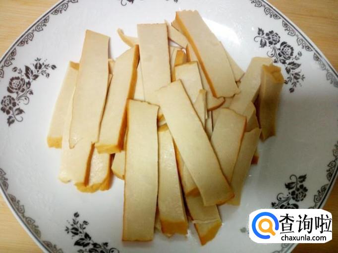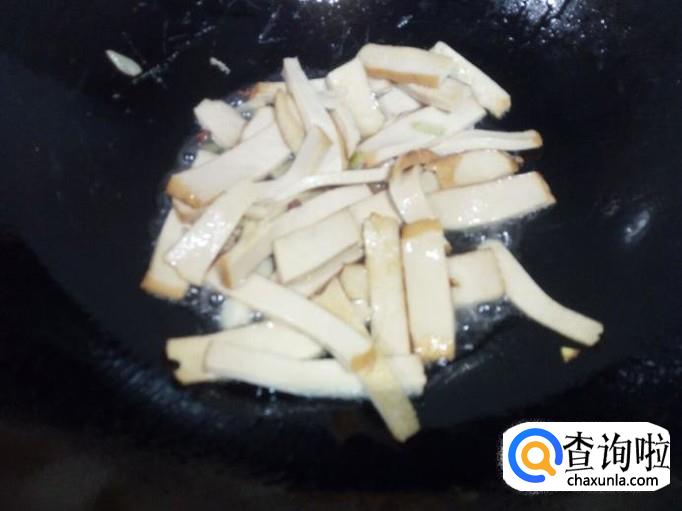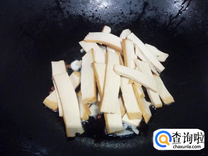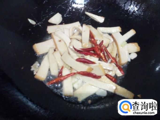 放入少量的水,这样炒出来的素鸡比较软。炒至素鸡变软,放入红干椒翻炒。
