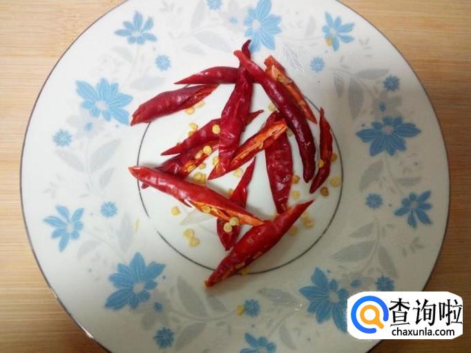 红干椒用水清洗干净,控干水分,斜刀切成段。