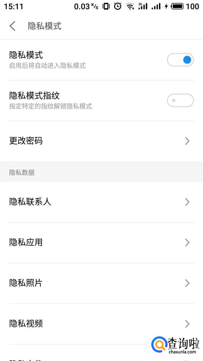 进入隐私模式设置界面,在隐私数据中点击“隐私应用”