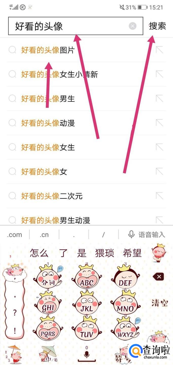 然后,点进去后,在搜索栏里面输入文字“好看的头像”,选择符合你要求的点击它,或者直接点“搜索”。