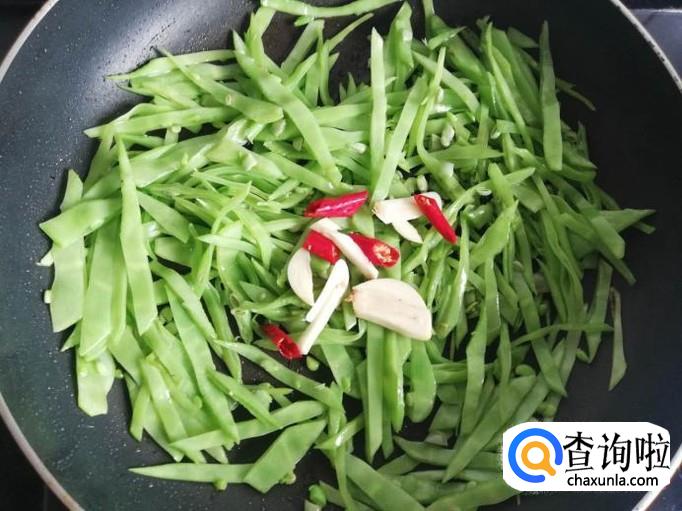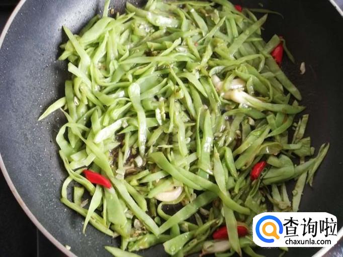 月亮菜炒至变色后,将辣椒和大蒜放入锅中翻炒