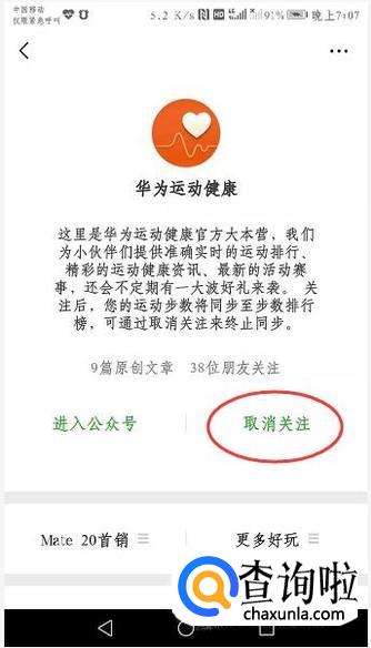 现在我们的微信也是可以记录步数的,我们的华为手机可以设置跟微信同步,打开“微信排行榜”,之后会自己跳到微信打开他们的“华为运动健康”公众号,这时候关注好可以了。