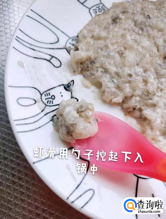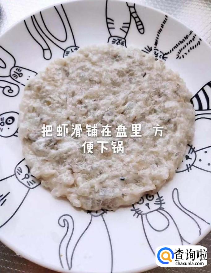 然后把虾滑平铺在盘子里,这样做能够方便下锅,如下图所示。