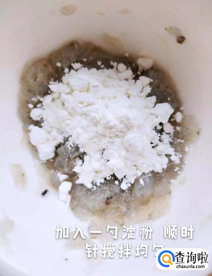 接着加入一勺的淀粉,顺时针搅拌均匀,如下图所示。