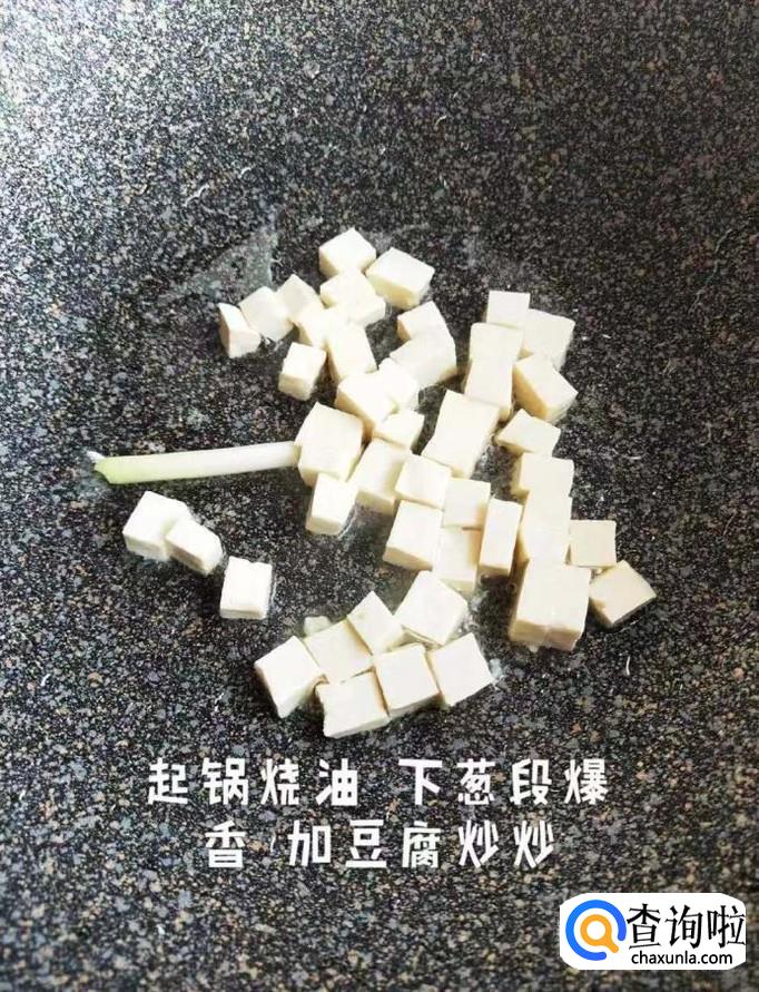 然后起锅烧油,下葱段爆香,倒入豆腐翻炒两分钟,如下图所示。