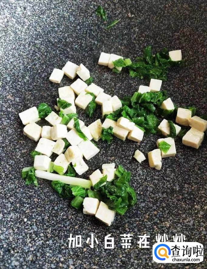 接着把焯过水的小白菜倒入锅中翻炒三分钟,如下图所示。