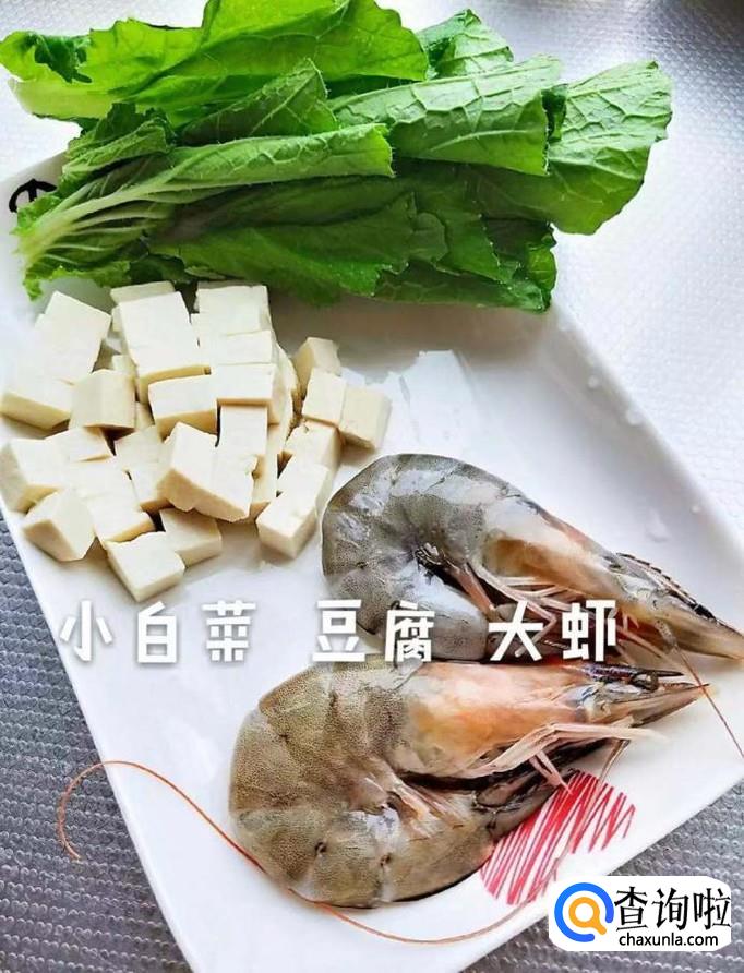 首先将小白菜洗干净,豆腐洗干净切成块,大虾去虾线,如下图所示。
