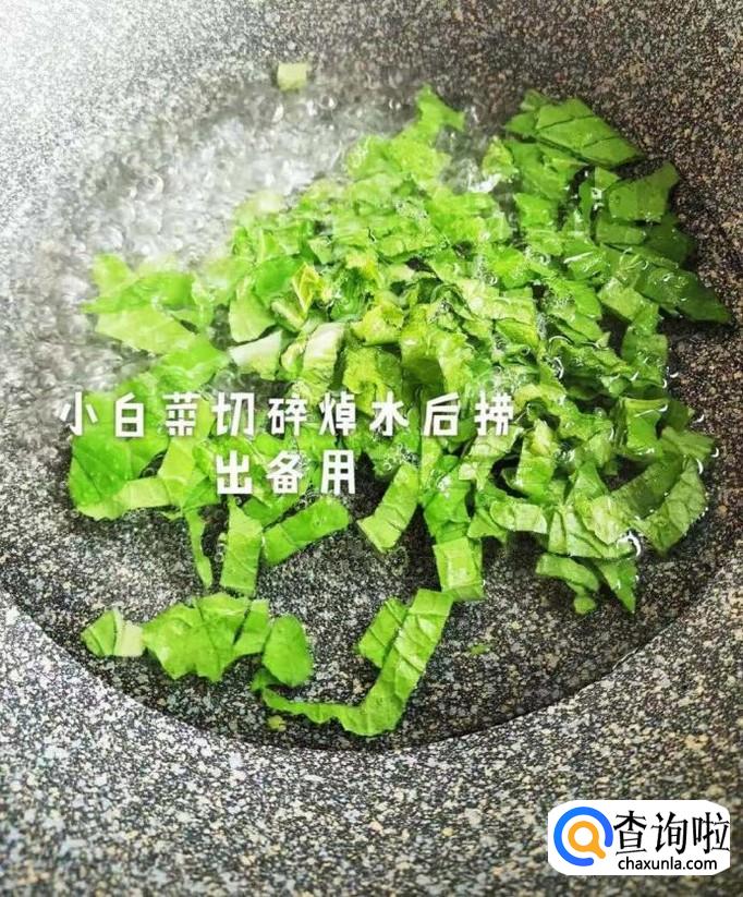 接着锅中放入适量的清水烧开,小白菜切碎,放入锅中焯一下水,如下图所示。