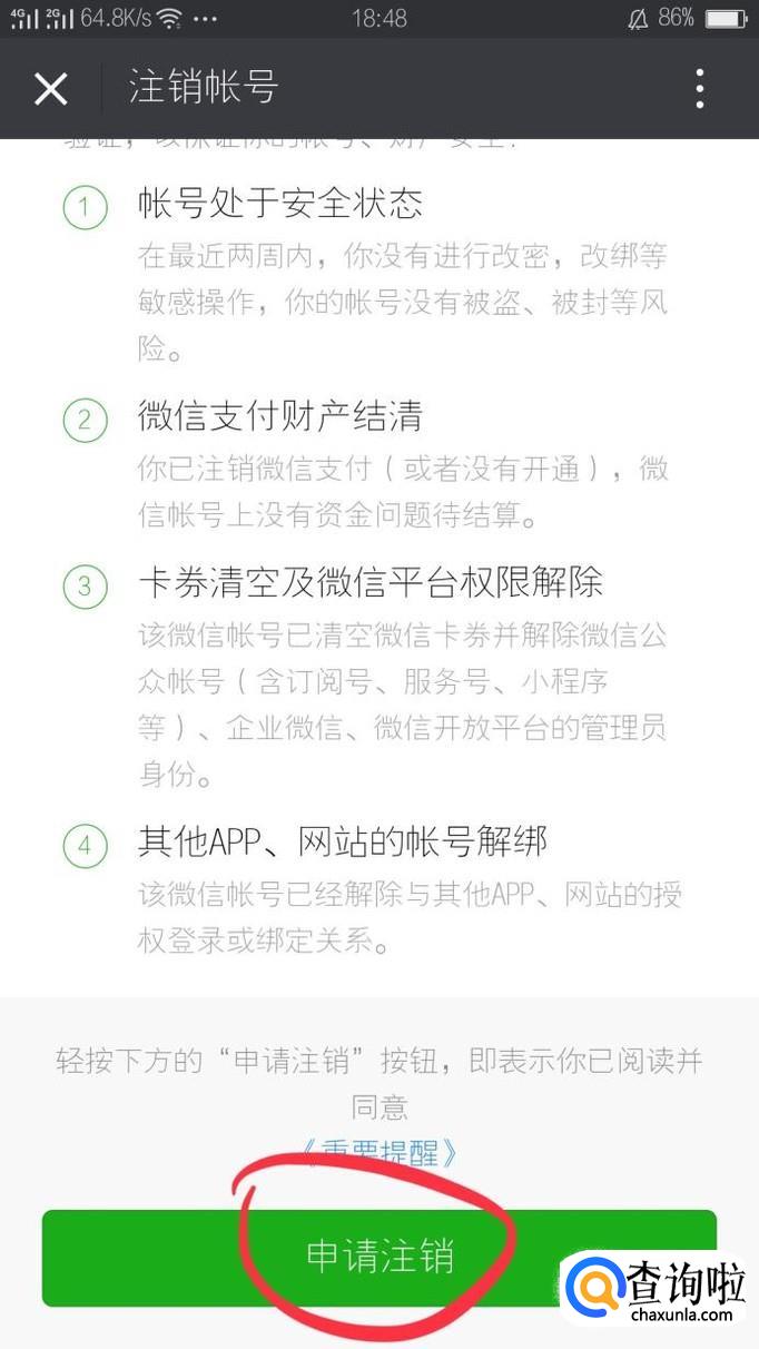 点开注销账号之后查看条款,点击申请注销按钮,如下图红色标注所示。