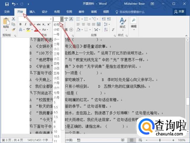 切换到工具栏的开始标签,在字号下拉列表中选择小号字号。如图所示: