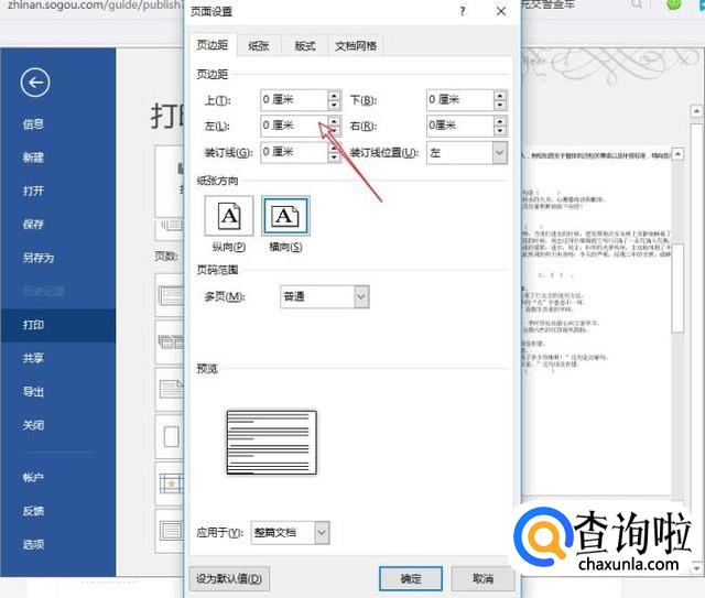 将页边距全部设置为0,并修改为横向打印。如图所示: