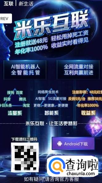 米乐互联自称是一个自动刷点击率,刷单的挂机机器人平台。注册就送48元,但是,这48元不能直接提现,只能购买一个普通机器人挂机。