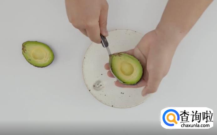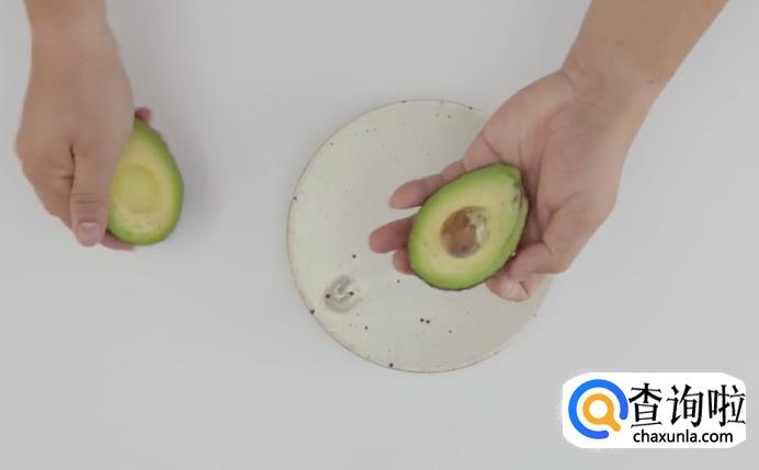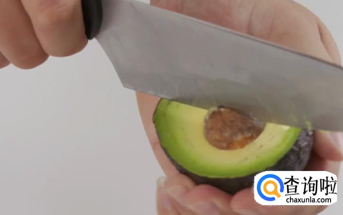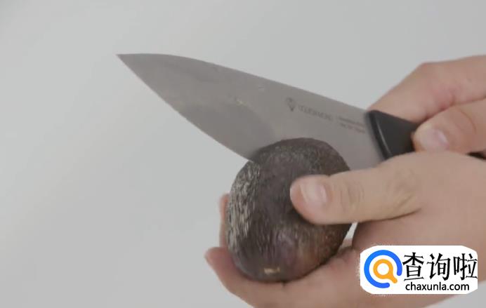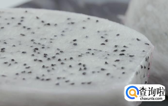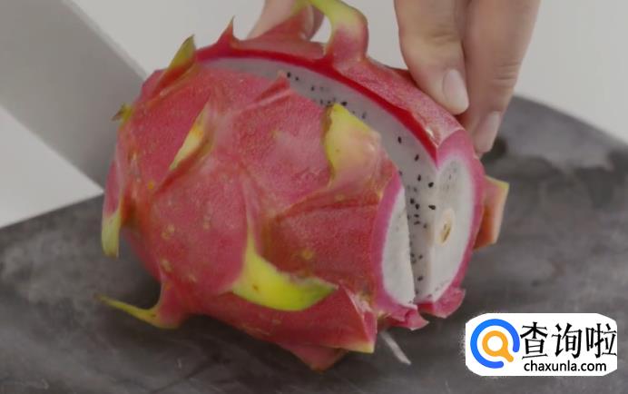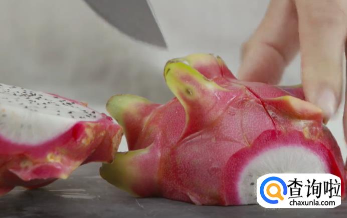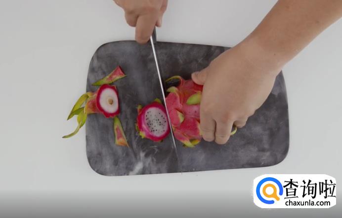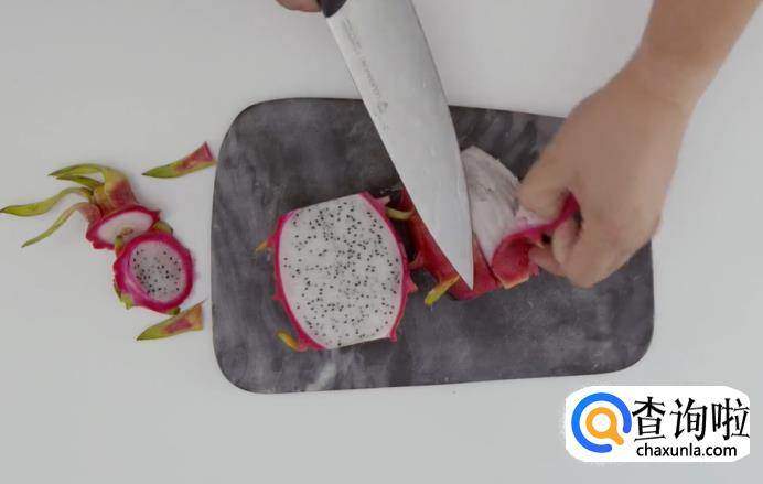 切开两半之后,拿刀在火龙果外皮中间轻轻划一刀,将外皮剥去。