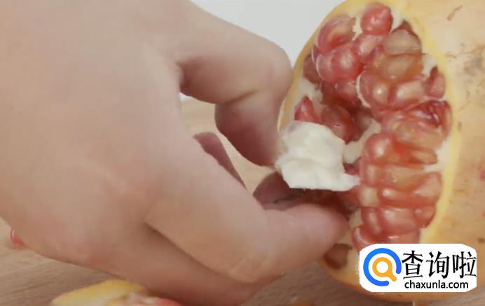先用刀将石榴的顶部切掉,再把石榴的内芯取出来。