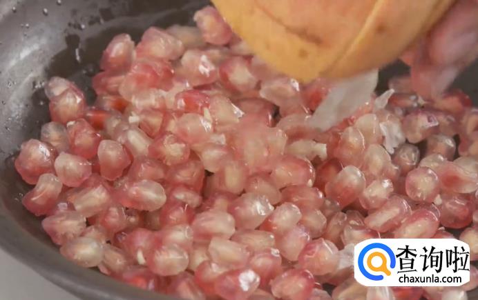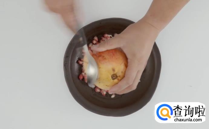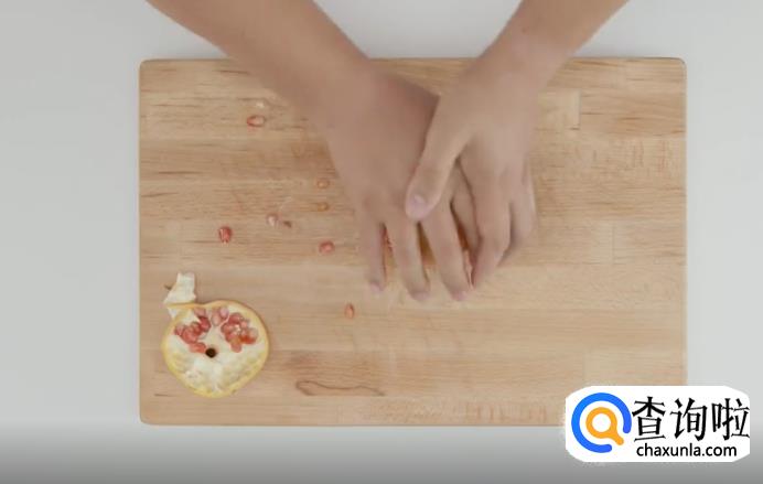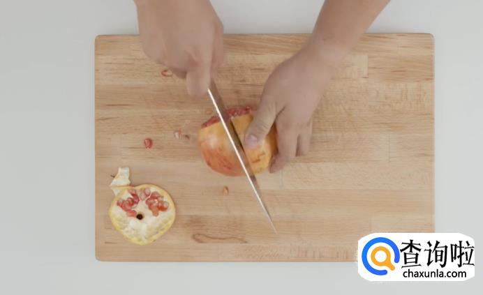 接着,在石榴的外皮上均匀的切出几道口子,然后用手将石榴揉松。