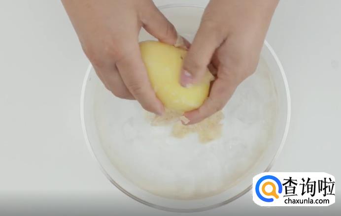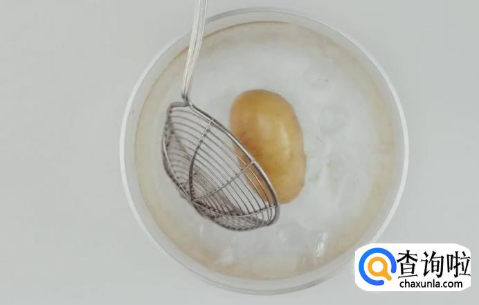 煮完后将土豆捞出来,浸泡在冰水里,这时的土豆皮很轻易就能剥开了。