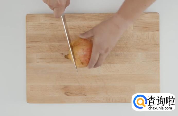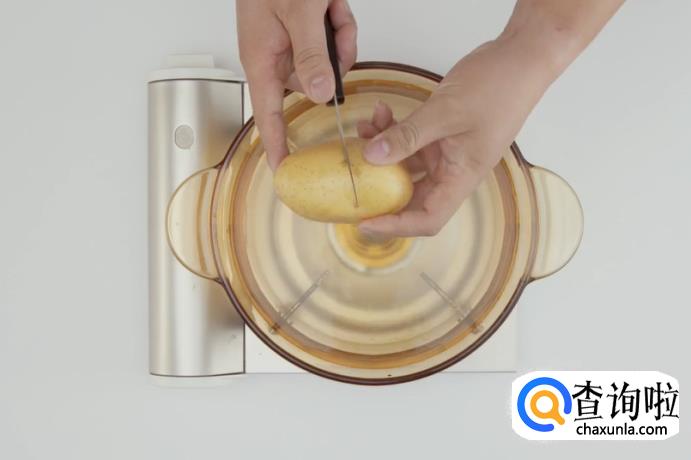 用刀绕着土豆的中间位置划一圈,将外皮划开。