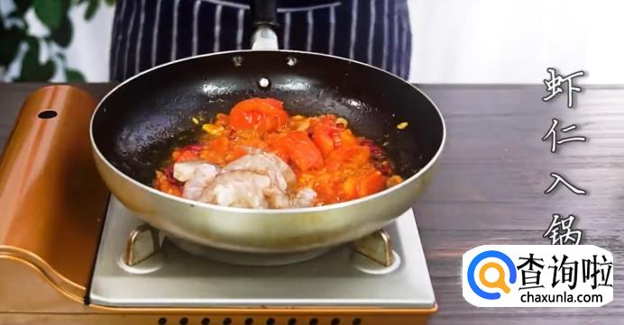 接着,加入咖喱粉拌匀后,倒入虾仁煸炒,炒熟后加入黑胡椒粉、食盐调味,拌匀后盛出。