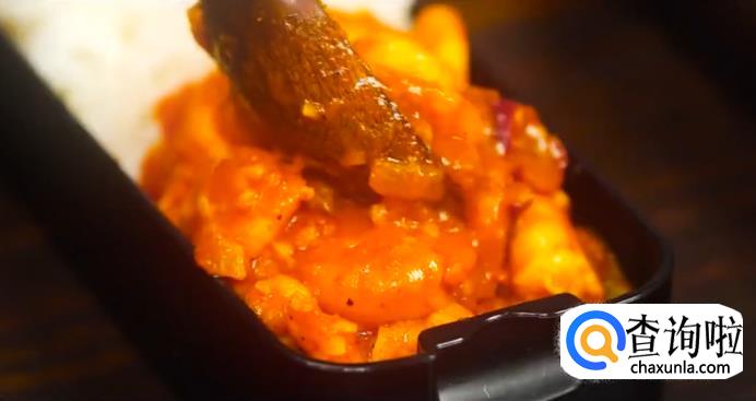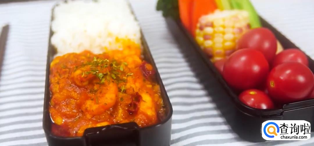将咖喱虾仁盛入便当盒中,撒上些许欧芹点缀;再根据个人口味搭配米饭和其他配菜,这样咖喱虾仁饭便当就做好了。