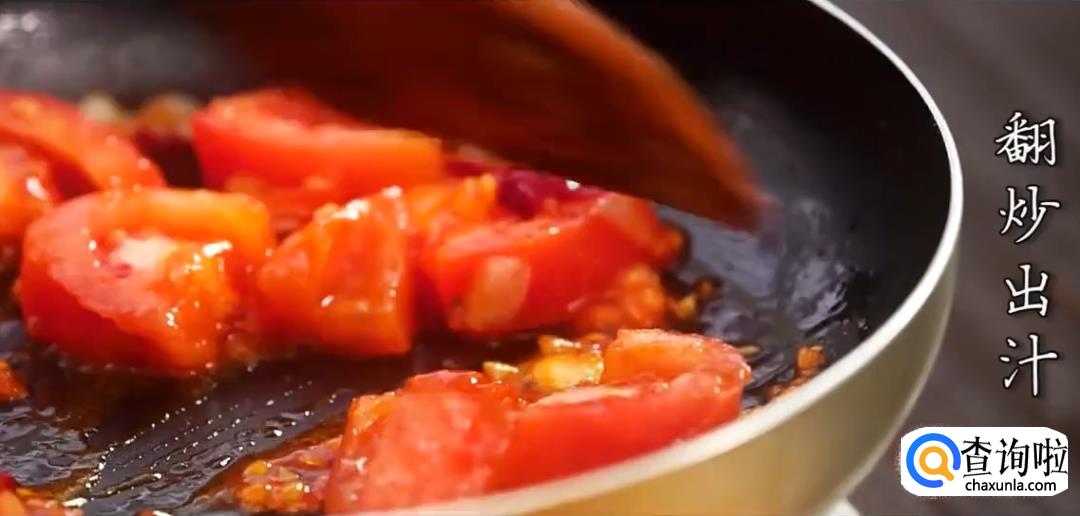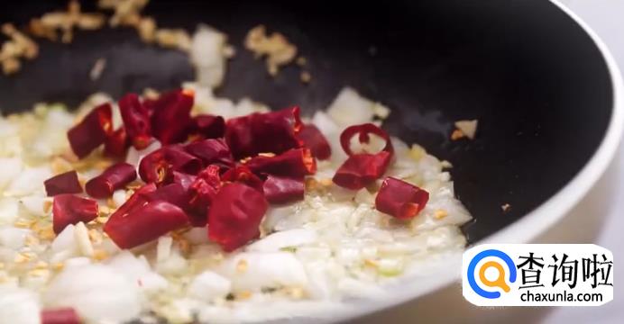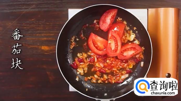 在锅中加入洋葱末、蒜末、干辣椒段煸香后,加入番茄酱、番茄块,翻炒出汁。