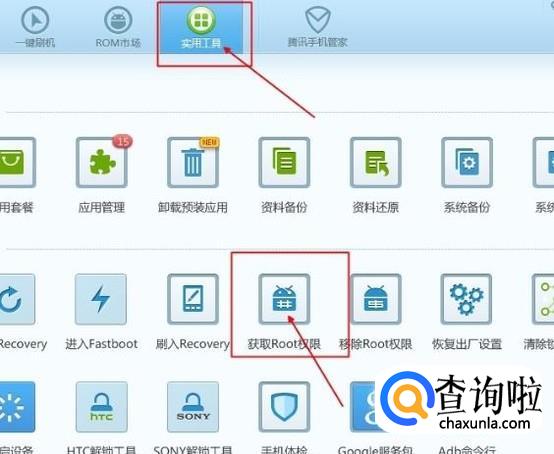 在实用工具中,单击获取root权限,按着操作提示即可完成手机root特权,如图所示。
