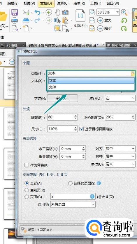 原来弹出了添加水印页面,在这个页面里有两种水印类型可供选择,文本和文件,我们先将类型选择为文本看看应该怎么添加水印。