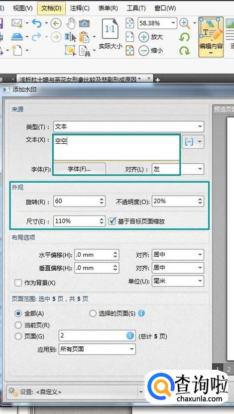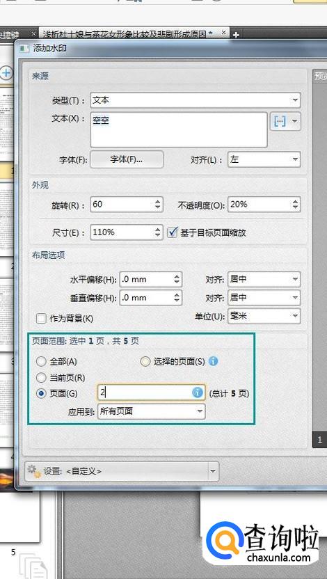 最后我们对添加水印页面范围进行设置,勾选全部选项所有的页面都会添加上水印,勾选当前页,只会给当前页面添加上水印。而勾选页面,可以在后面的文本框输入需要添加水印的页面页码或页面页码范围。设置好后,点击确定,完成添加。