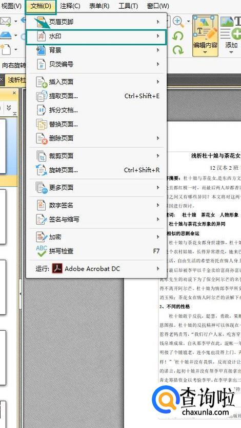 当我们打开pdf文件后,我们需要找到水印工具,我们点击界面上方的文档按钮后弹出了许多工具,我们在其中找到水印工具。
