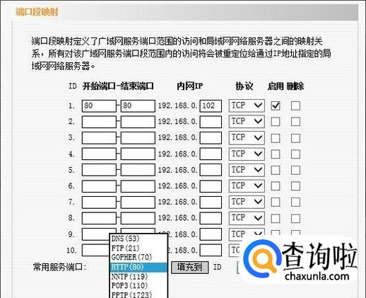 在“常用服务端口”选择HTTP(80),然后填充到ID1,之后查询出自己机器的IP地址。