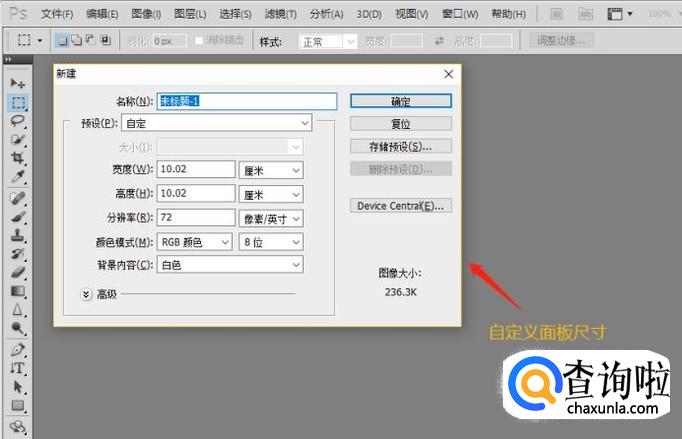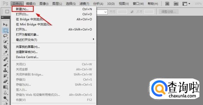 依旧我们还是需要借助第三方制作工具PS软件,打开它以后依次点击"文件"-"新建",然后自定义一张空白的画板尺寸,如图