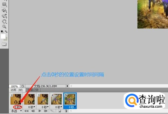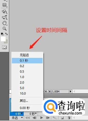 依此方法类推,我们一共创建5帧,每一帧对应右侧的三个图层,其余图层前面的小眼睛关闭;接下来就是给每帧之间设置一个时间间隔,系统默认的是0秒,我们设置为0.1秒或者其他都可以,如下图;