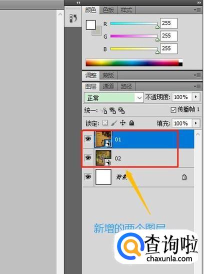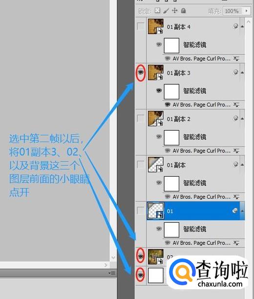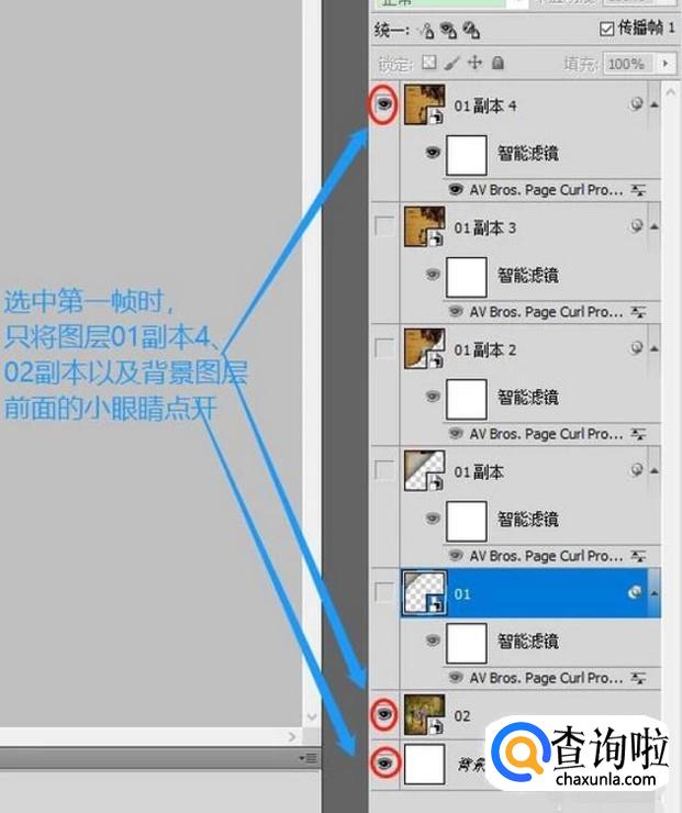 接着在左下角复制一帧,选择第二帧以后,将右侧的“01副本3”“02”以及"背景"这三个图层前面的小眼睛打开;