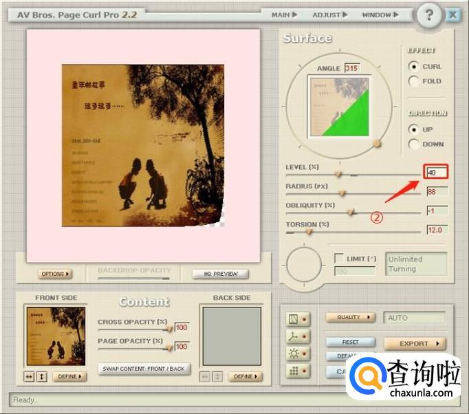 然后将第一行图层前面的小眼睛去掉,选择第二个图层“01副本3”,同样打开AV Bros.page curl插件,这次我们将level设置为40
